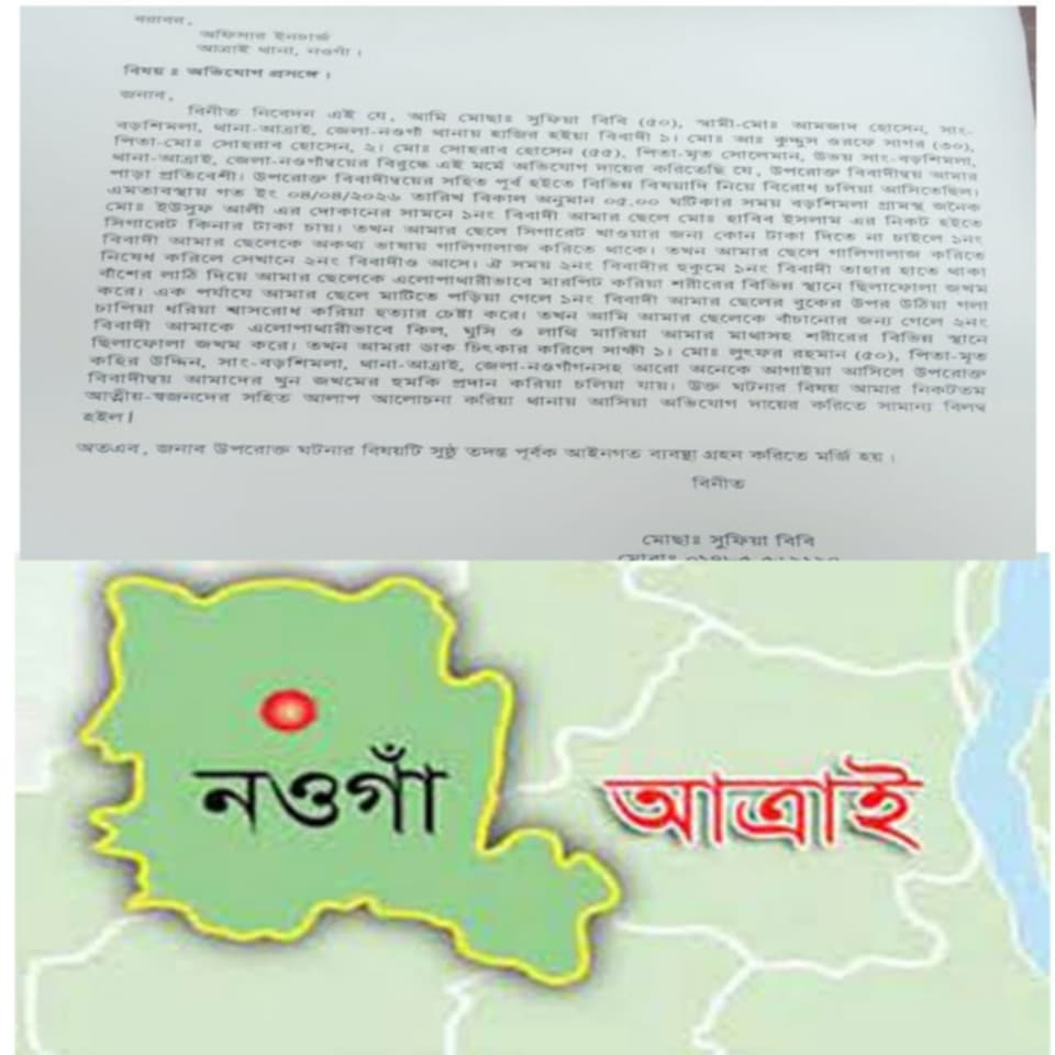 নওগাঁ জেলার আত্রাই উপজেলায় সিগারেট কেনার টাকা না দেওয়ায় এক যুবক ও তাঁর মাকে পিটিয়ে গুরুতর জখম করার অভিযোগ উঠেছে। আত্রাই উপজেলার ৮ নং হাটকালুপাড়া ইউনিয়নের বড়শিমলা গ্রামে গত ৪ এপ্রিল বিকেলে এ ঘটনা ঘটে। এ ঘটনায় ভুক্তভোগী মোসা.সুফিয়া বিবি (৫০) বাদী হয়ে আত্রাই থানায় একটি লিখিত অভিযোগ দায়ের করেছেন। অভিযোগ সূত্রে জানা যায়, ঘটনার দিন বিকেল আনুমানিক ৫টার দিকে বড়শিমলা গ্রামের জনৈক ইউসুফ আলীর দোকানের সামনে সুফিয়া বিবির ছেলে মো. হাবিব ইসলামের কাছে সিগারেট কেনার জন্য টাকা দাবি করেন একই গ্রামের মো.আব্দুল কুদ্দুস ওরফে সাগর (৩০)। হাবিব টাকা দিতে অস্বীকৃতি জানালে সাগর তাঁকে অকথ্য ভাষায় গালিগালাজ শুরু করেন। এক পর্যায়ে সাগরের বাবা মো. সোহরাব হোসেনের (৫৫) নির্দেশে সাগর বাঁশের লাঠি দিয়ে হাবিবকে এলোপাতাড়ি মারধর করেন। হাবিব মাটিতে পড়ে গেলে সাগর তাঁর বুকের ওপর চেপে বসে গলা টিপে ধরে শ্বাসরোধ করে হত্যার চেষ্টা চালান। এ সময় ছেলেকে বাঁচাতে মা সুফিয়া বিবি এগিয়ে এলে বিবাদীরা তাঁকে কিল, ঘুষি ও লাথি মেরে শরীরের বিভিন্ন স্থানে জখম করেন। পরে স্থানীয় বাসিন্দা মো. লুৎফর রহমানসহ প্রত্যক্ষদর্শীরা এগিয়ে এলে বিবাদীরা প্রাণনাশের হুমকি দিয়ে ঘটনাস্থল ত্যাগ করেন। আহত অবস্থায় মা ও ছেলেকে উদ্ধার করে স্থানীয়ভাবে চিকিৎসা দেওয়া হয়েছে। আত্রাই থানার ভারপ্রাপ্ত কর্মকর্তা (ওসি) বরাবর দেওয়া অভিযোগে সুফিয়া বিবি উল্লেখ করেন, পারিবারিক ও পূর্ব শত্রুতার জের ধরে এই পরিকল্পিত হামলা চালানো হয়েছে। তিনি এই ঘটনার সুষ্ঠু তদন্ত ও দোষীদের দৃষ্টান্তমূলক শাস্তির দাবি জানিয়েছেন। এ বিষয়ে আত্রাই থানার অফিসার ইনচার্জ (ওসি)আব্দুল করিম জানান, “অভিযোগটি আমরা পেয়েছি। বিষয়টি তদন্ত সাপেক্ষে দ্রুত আইনগত ব্যবস্থা গ্রহণ করা হবে।