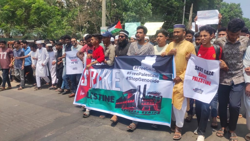 মিছিলে অংশ নেওয়া সাধারণ জনতা ইসরাইলের সকল পণ্য বয়কট করার স্লোগান তোলে ,