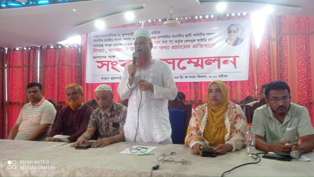 স্টাফ রিপোর্টার: ১৫১ ময়মনসিংহ ৬ ফুলবাড়িয়া থেকে নির্বাচিত মাননীয় জাতীয় সংসদ সদস্য ও শিক্ষা মন্ত্রণালয় সম্পর্কিত সংসদীয় স্থায়ী কমিটির সদস্য আলহাজ্ব আঃ মালেক সরকারের বিরুদ্ধে উৎপল কর গং কর্তৃক ফেসবুক আইডি থেকে মিথ্যা বানোয়াট উস্কানিমূলক তথ্য প্রচারের প্রতিবাদে জনগনের পক্ষে সংবাদ সম্মেলন করেছেন। গতকাল সোমবার দুপুরে কুটুমবাড়ী কনভেনশন সেন্টারে স্থানীয় সাংবাদিকদের সাথে সংবাদ সম্মেলন করেন।