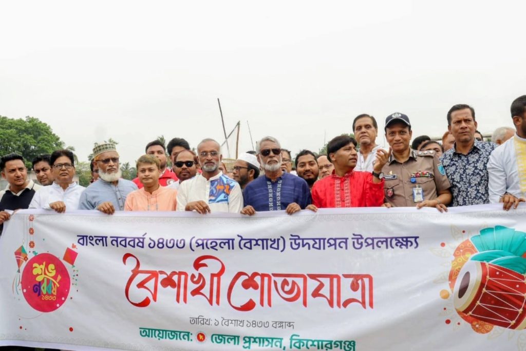 নতুন আশা আর অবারিত আনন্দের বার্তা নিয়ে বাঙালির দুয়ারে এসেছে নতুন বছর। আজ মঙ্গলবার (১৪ এপ্রিল ২০২৬) কিশোরগঞ্জে যথাযোগ্য মর্যাদা ও উৎসবমুখর পরিবেশে উদযাপিত হয়েছে বাংলা নববর্ষ ১৪৩৩। এদিন সকালে অশুভ শক্তির বিনাশ আর শুভবোধের প্রত্যাশায় শহরের পুরাতন স্টেডিয়াম প্রাঙ্গণ থেকে বের করা হয় বর্ণিল বৈশাখী শোভাযাত্রা। সকাল ৯টার দিকে কিশোরগঞ্জ জেলা প্রশাসক মোহাম্মদ আসলাম মোল্লার সভাপতিত্বে পুরাতন স্টেডিয়াম এলাকা থেকে শুরু হয় মূল শোভাযাত্রা। ঐতিহ্যবাহী বাঙালি সংস্কৃতির নানা অনুষঙ্গ নিয়ে হাজারো মানুষের অংশগ্রহণে শোভাযাত্রাটি পুরো শহর প্রদক্ষিণ করে। ঢাক-ঢোল, বাঁশির সুর আর তরুণ-তরুণীদের লাল-সাদা পোশাকের রঙে শহরের রাস্তাগুলো যেন এক জীবন্ত ক্যানভাসে রূপ নেয়। নানা বয়সী মানুষের উপস্থিতিতে পুরো শহর আজ উৎসবে মেতে ওঠে। শোভাযাত্রা শেষে পুরাতন স্টেডিয়াম প্রাঙ্গণে অনুষ্ঠিত হয় মনোজ্ঞ সাংস্কৃতিক অনুষ্ঠান। সেখানে স্থানীয় শিল্পীদের পরিবেশনায় গান, নৃত্য এবং কবিতা পাঠের মাধ্যমে ফুটিয়ে তোলা হয় বাঙালিয়ানা ও লোকজ ঐতিহ্যের নান্দনিক রূপ। দর্শকদের মুহুর্মুহু করতালিতে অনুষ্ঠানস্থল মুখর হয়ে ওঠে, যা উপস্থিত সকলের হৃদয়ে এক নতুন প্রাণশক্তি সঞ্চার করে। অনুষ্ঠানে প্রধান অতিথি হিসেবে উপস্থিত ছিলেন কিশোরগঞ্জ-১ আসনের মাননীয় সংসদ সদস্য মোঃ মাজহারুল ইসলাম এমপি। তিনি নববর্ষের শুভেচ্ছা বিনিময়কালে অসাম্প্রদায়িক ও সমৃদ্ধ বাংলাদেশ গড়ার প্রত্যয় ব্যক্ত করেন। বিশেষ অতিথি হিসেবে উপস্থিত থেকে অনুষ্ঠানের গুরুত্ব বৃদ্ধি করেন কিশোরগঞ্জ জেলার পুলিশ সুপার ড. এস এম ফরহাদ হোসেন এবং জেলা পরিষদের প্রশাসক খালেদ সাইফুল্লাহ সোহেল খান। এছাড়াও জেলা প্রশাসনের বিভিন্ন দপ্তরের ঊর্ধ্বতন কর্মকর্তা, জেলা পুলিশের ঊর্ধ্বতন সদস্য, বিভিন্ন রাজনৈতিক দলের নেতৃবৃন্দ, স্থানীয় শিল্পীগোষ্ঠী, গণমাধ্যমকর্মী এবং সর্বস্তরের বিপুলসংখ্যক উৎসুক জনতা নববর্ষের এই আনন্দযাত্রায় শরিক হন। দিনব্যাপী এই আয়োজন ছিল কিশোরগঞ্জবাসীর জন্য সম্প্রীতি ও মিলনের এক অনন্য দৃষ্টান্ত। বছর ঘুরে আসা এই নববর্ষ ১৪৩৩ আমাদের মাঝে বয়ে আনুক অনাবিল শান্তি ও সমৃদ্ধি—এমনই প্রত্যাশা নিয়ে শেষ হলো আজকের বর্ণিল উৎসব।