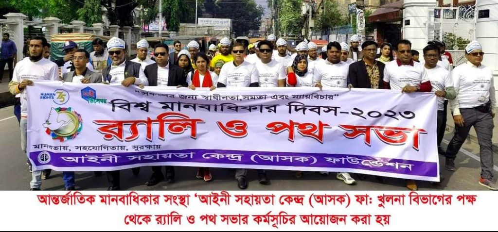 মোঃ সাবিউদ্দিন: খুলনায় বিভিন্ন কর্মসূচির মধ্য দিয়ে বিশ্ব মানবাধিকার দিবস পালিত হয়েছে। দিবসটি উপলক্ষে জাতিসংঘ নিবন্ধিত আন্তর্জাতিক মানবাধিকার সংস্থা ‘আইনী সহায়তা কেন্দ্র (আসক) ফাউন্ডেশন খুলনা বিভাগীয় কমিটির উদ্যোগে র্যালি ও পথ সভা অনুষ্ঠিত হয়।