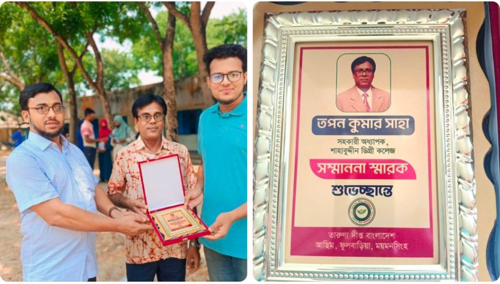 মঙ্গলবার (৩০ এপ্রিল) দুপুরে শাহাবুদ্দিন ডিগ্রি কলেজে এই বিদায় সংবর্ধনা অনুষ্ঠিত হয়। শাহাবুদ্দিন ডিগ্রি কলেজের সহকারী অধ্যাপক ও তারুণ্য দীপ্ত বাংলাদেশ-এর উপদেষ্টা জনাব তপন কুমার সাহা’র শেষ কর্মদিবস ও অবসর জনিত বিদায় উপলক্ষে তারুণ্য দীপ্ত বাংলাদেশের পক্ষ থেকে তপন কুমার সাহাকে সম্মাননা স্মারক প্রদান করা হয়।
