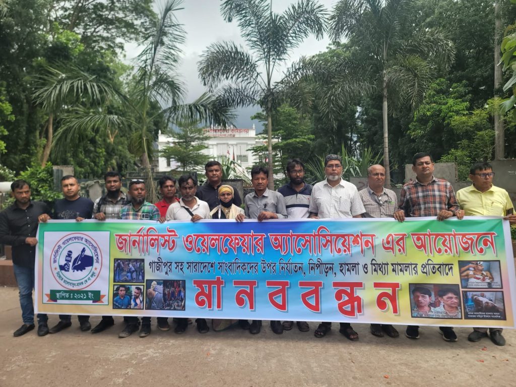 সারাদেশে দায়িত্ব পালনকালে সাংবাদিকের উপর সন্ত্রাসী হামলা, মামলা,প্রশাসন কতৃক চাঁদাবাজি মামলার হয়রানির প্রতিবাদে ও মামলাবাজ, হামলাকারীদের দৃষ্টান্তমূলক শাস্তির দাবিতে গাজীপুরে মানববন্ধন করেছে জার্নালিস্ট ওয়েলফেয়ার এসোসিয়েশন। সোমবার (১৯ মে) বেলা ১২টায় গাজীপুর জেলা প্রশাসক কার্যালয়ের সামনে এ মানববন্ধন অনুষ্ঠিত হয়। জার্নালিস্ট ওয়েলফেয়ার এসোসিয়েশনের সভাপতি গাজী মামুনের সভাপতিত্বে ও বাসন মেট্রো থানা প্রেসক্লাবের সভাপতি মোঃ সাজ্জাকুল ইসলাম রাজ্জাকের পরিচালনায় মানববন্ধনে বক্তারা বলেন, দেশে সাংবাদিকদের উপর নির্যাতনের ঘটনা বাড়ছে। সাংবাদিক দম্পতি সাগর-রুনির হত্যাকাণ্ডের এখনো কোনো কূল-কিনারা হয়নি। গাজীপুরের কাপাসিয়া ও সারাদেশে সাংবাদিকদের উপর হামলা, সাংবাদিকদের নামে মিথ্যা চাঁদাবাজির মামলা দিয়ে হয়রানি বিরুদ্ধে কঠোর কোনো পদক্ষেপ আমরা দেখিনি। এ অবস্থার উন্নতি না হলে তা দেশের জন্য সুফল বয়ে আনবে না। মানববন্ধনে জার্নালিস্ট ওয়েলফেয়ার অ্যাসোসিয়েশনের কেন্দ্রীয় কমিটির সভাপতি গাজী মামুনের বক্তব্যে বলেন, সারা দেশজুড়ে যারা উচ্চবিত্ত, মধ্যবিত্ত, নিম্নবিত্ত সহ সর্বস্তরের মানুষের সমস্যাগুলো সারা দেশের মানুষের কাছে পৌঁছায়, আজ তাদের নিজেদের সমস্যা নিয়ে রাস্তায় দাঁড়াতে হচ্ছে, নিরাপত্তার হুমকিতে রয়েছে সাংবাদিকরা, সাংবাদিকদের ওপর হামলা করে আপনারা আপনাদের নিজেদের অপরাধ ঢেকে রাখতে চাইছেন, আপনাদের এসব অপরাধের চিত্র ঠিকই গণমাধ্যমে আবারও উঠে আসবে, সাংবাদিকরা কারো তাবেদারি করে না, সাংবাদিক কোন দলের নয়, কোন ব্যক্তির নয়, সাংবাদিক দেশের ন্যায় প্রতিষ্ঠিত হওয়ার পক্ষে কাজ করে, সমাজে ঘটে যাওয়া সকল ঘটনা গুলো জনসম্মুখে নিয়ে আসে, সাংবাদিকের তথ্য জনসম্মুখে পৌঁছালে এতে জনসাধারণ উপকৃত হয়, দোষীরা সমাজের চিহ্নিত হয়, আর নিরপরাধ মানুষকে কেউ ফাঁসাতে চাইলে সেই বিষয়গুলোও সাংবাদিকরা জনসম্মুখে তুলে ধরেন, সরকারি বিভিন্ন নীতিমালা আইন কানুন এবং দিক নির্দেশনা নিউজের মাধ্যমে জনতার মাঝে পৌঁছে দেয সাংবাদিকরা। এতে করে তারা দ্রুত সরকারের সকল সিদ্ধান্তগুলো জানতে পারেন, আর এখন কিছু কুচক্রী মহল, সন্ত্রাসী, চাঁদাবাজ, মাদক কারবারি, সরকারি আমলা সহ কিছু অসাধু পুলিশ কর্মকর্তারা সাংবাদিকদের গলা চেপে ধরার চেষ্টা করছেন, তাদেরকে সংশোধিত হয়ে নিজের সৎকর্মে ফিরে আসার আহ্বান করেন, প্রত্যেক ব্যক্তি নিজ নিজ কর্ম ঠিকভাবে পালন করলে দুর্নীতি অপরাধে জড়িত হতে পারতেন না, এসব ক্ষেত্রে মূলত দায়ী থাকেন তাদের ঊর্ধ্বতন কর্মকর্তারা, তাদের ঠিকভাবে দেখবাল করলে অন্যয়টা অনেকাংশই কমে আসতো। মানববন্ধনে বক্তারা হামলাকারীদের দৃষ্টান্তমূলক শাস্তি দাবি করেন