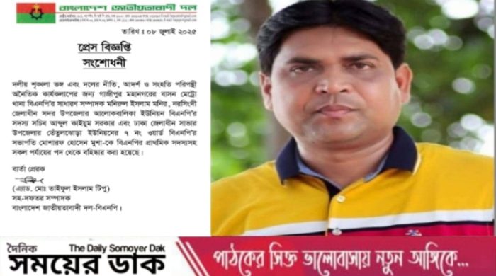 জোবায়ের হোসেন ইফতি, বিশেষ প্রতিনিধি : দলীয় শৃঙ্খলা ভঙ্গ এবং দলের নীতি, আদর্শ ও সংহতি পরিপন্থি অনৈতিক কার্যকলাপের অভিযোগে গাজীপুর মহানগরের বাসন মেট্রো থানা বিএনপি’র (সাধারণ সম্পাদক) মনিরুল ইসলাম (মনির)কে